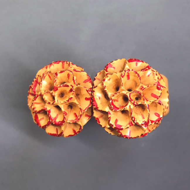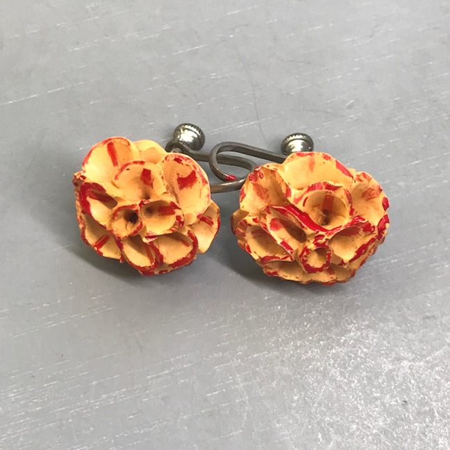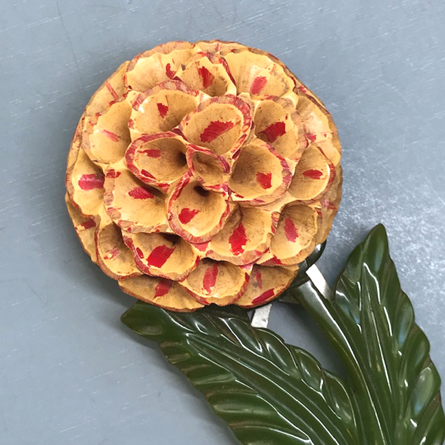 in Matthew Burkholz book "The Bakelite Jewelry Collection" on page 56. This carved double flower motif was also used in brooches,
