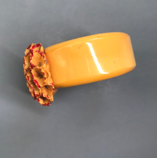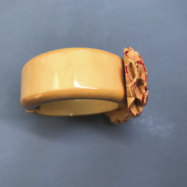 butterscotch flower carved hinged bangle bracelet, 6-1/2" by 1-1/4" by 5/8".